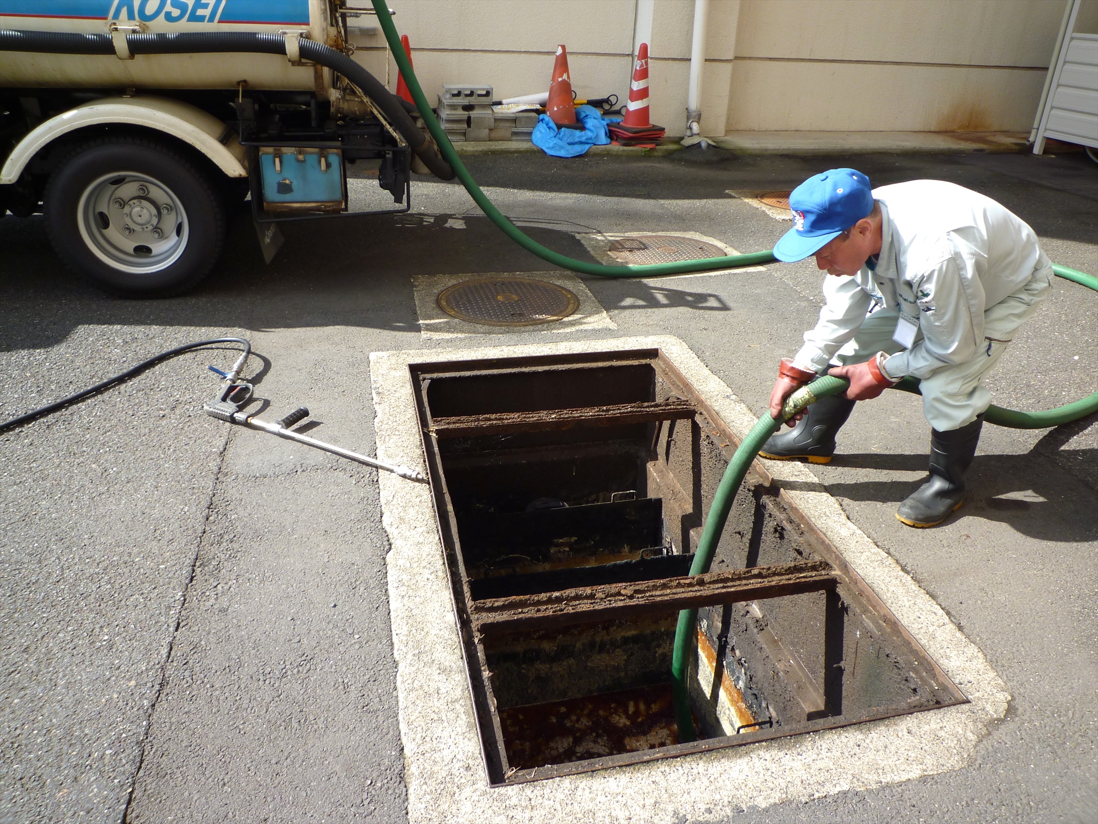 専用車両で槽内の油脂等を吸引し、高圧洗浄水でカゴの目の閉塞部分を取り除きました。